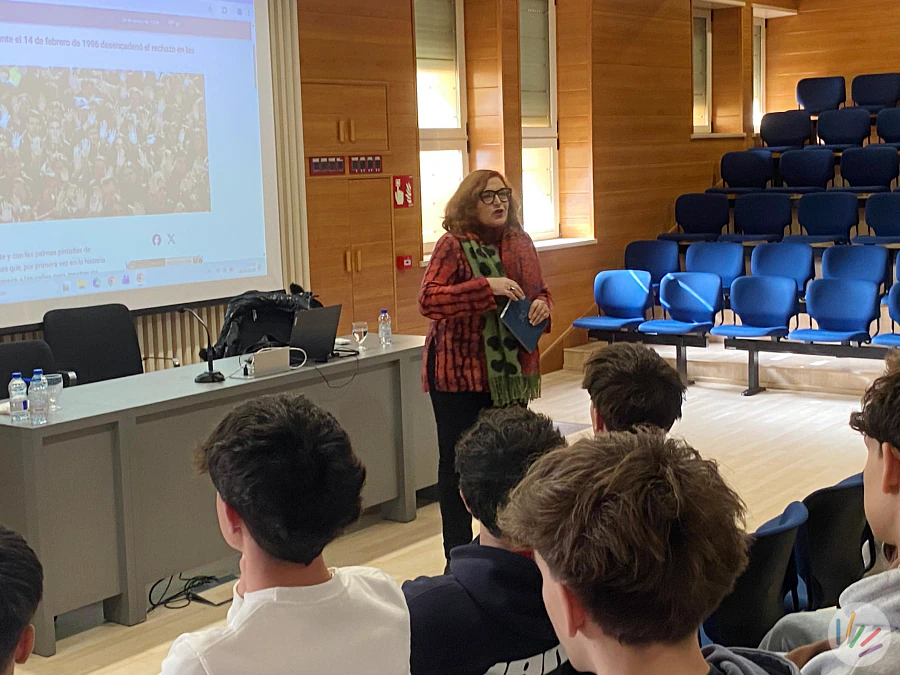 120 alumnos de bachillerato del colegio de los Jesuitas en Pamplona han escuchado el testimonio de Cristina Cuesta y la historia de Miguel Ángel Blanco, dentro del proyecto HISTORIA DEL TERRORISMO iniciativa de los profesores del centro.