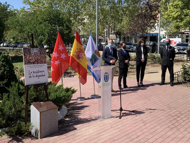 Miembros de asociaciones de víctimas del terrorismo y políticos se han congregado en los jardines que llevan su nombre en el distrito de Chamartín. Entre ellos han estado la presidenta de la Comunidad de Madrid, Isabel Díaz Ayuso; consejeros del Ejecutivo regional; el alcalde de Madrid, José Luis Martínez-Almeida; portavoces de la Asamblea de Madrid; el presidente del PP, Pablo Casado, y la hermana de Miguel Ángel Blanco, Marimar.