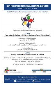 Cristina Cuesta, directora de la FMAB, participa en la mesa redonda «La figura del héroe ciudadano frente al terrorismo» que tendrá lugar el día 28 en el Hotel María Cristina de San Sebastián coincidiendo con el acto de entrega...