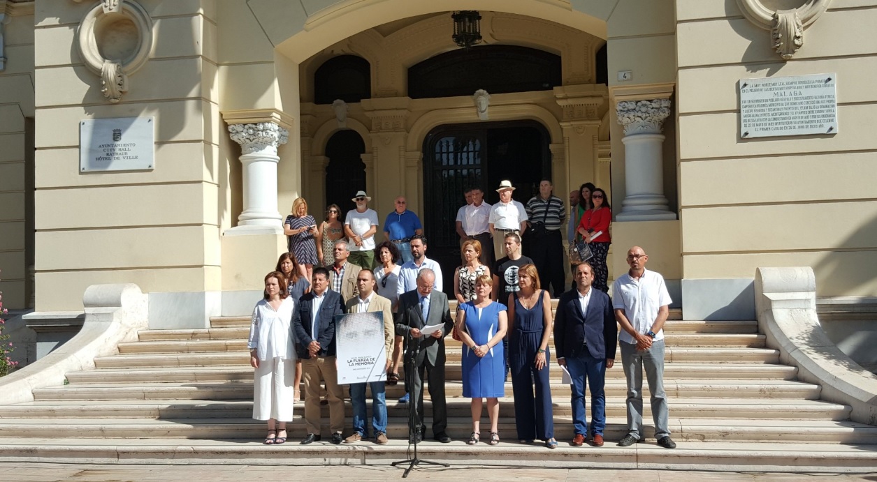 Foto: La corporación municipal de Málaga con su alcalde, Francisco de la Torre, a la cabeza rinde homenaje a Miguel Ángel Blanco en la entrada del Ayuntamiento en el XIX aniversario de su asesinato.